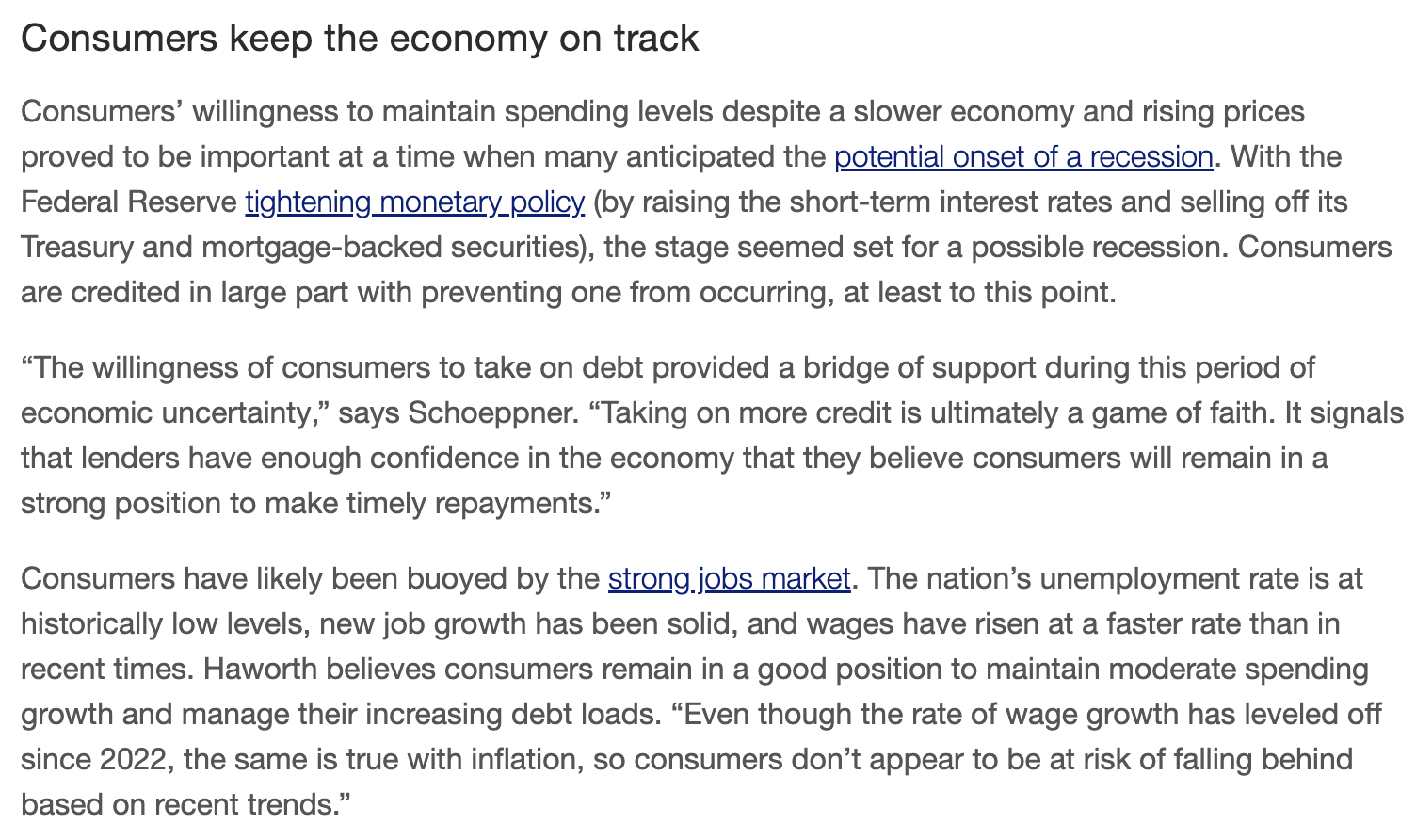 Below is an excerpt from a US Bank article on the state of the US economy in Sept 2023. This article is pretty annoying to me; just because consumers seem like they may be able to pay off their debts doesn’t mean their spending is good, let alone optimal!