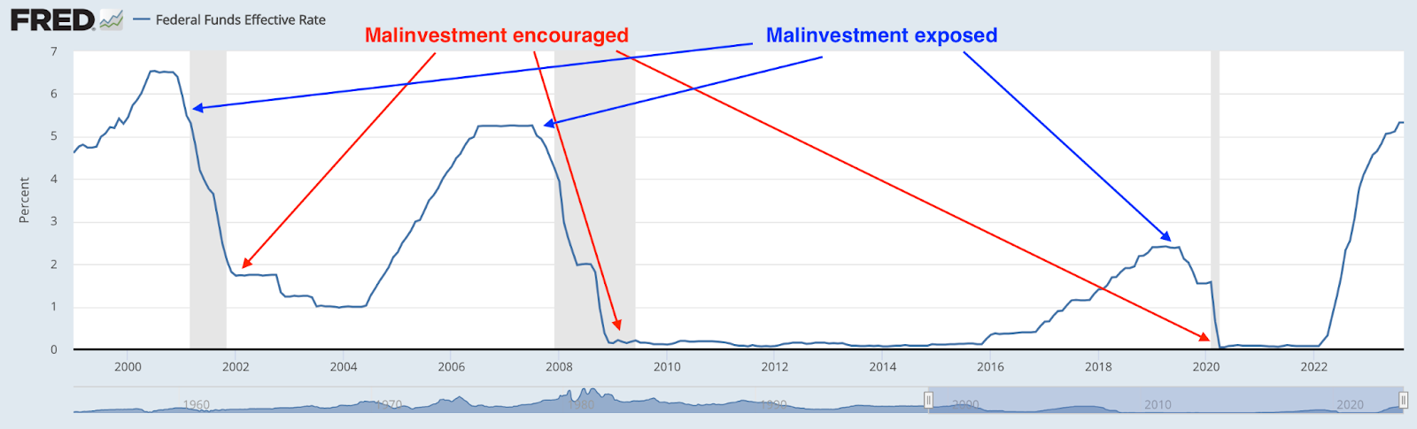 In fact, I think most malivestments that have been exposed over the past 20 years are the result of investments made with artificially low interest rates that make positive nominal returns, but negative real returns. These ventures with negative real returns are exposed when the inflation required to keep up the ZIRP policy inevitably starts to creep into the economy. Then, to make matters worse, the Fed is forced to raise rates to curb inflation, making “saving” these failing businesses even more expensive because the cost of borrowing has gone up. In my view, this is a pretty clear cycle that we’ve fallen victim to consistently since the ‘80s.