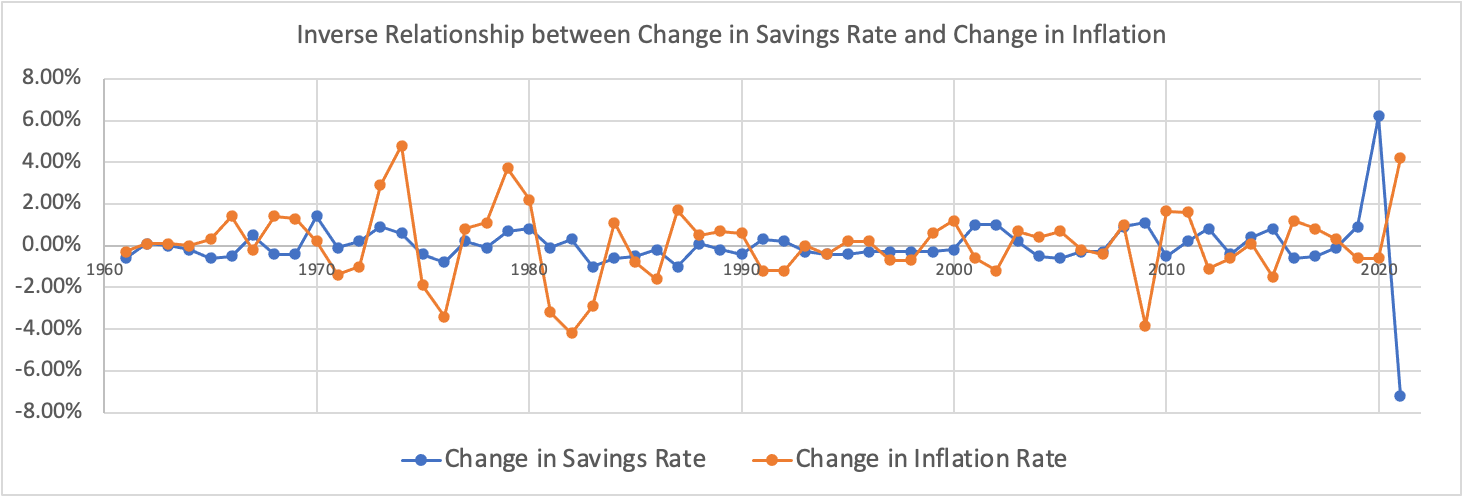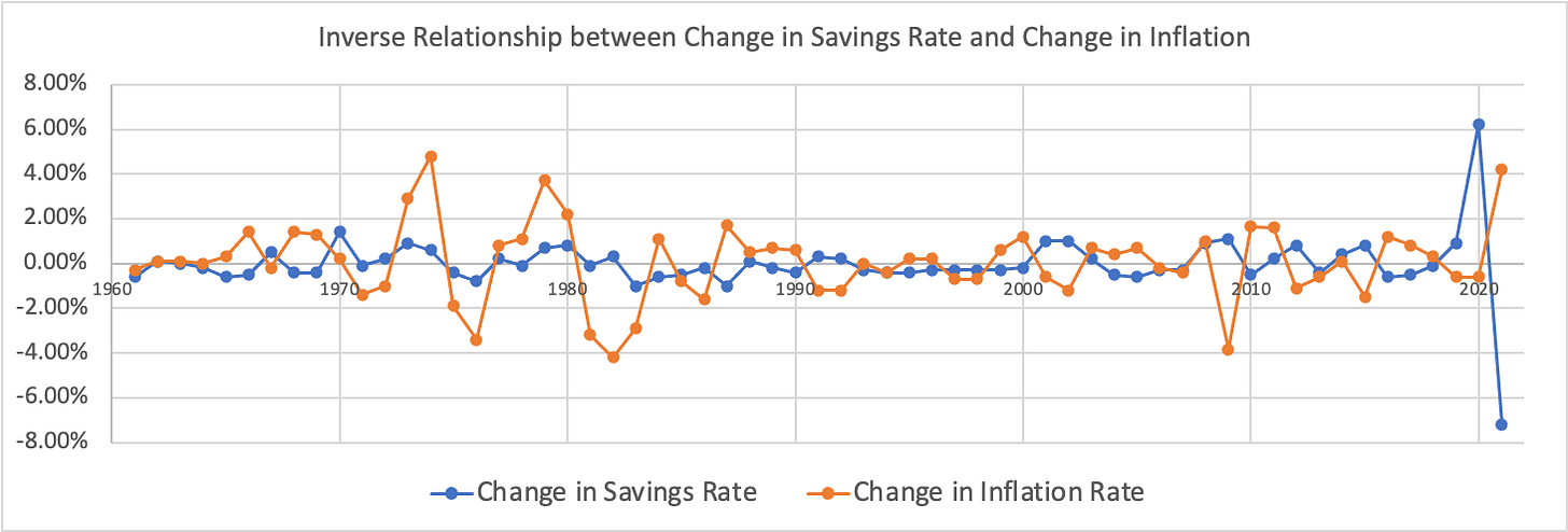 This chart shows an admittedly tenuous, but I think still useful, relationship between the change in the inflation rate, and the change in the household savings rate in the US. The relationship observed is as inflation increases, the household savings rate decreases. This can be seen as a quite consistent trend since 1990. This also makes logical sense: when inflation increases, your currency will buy less in the future, so you rationally would save less and spend more today.
